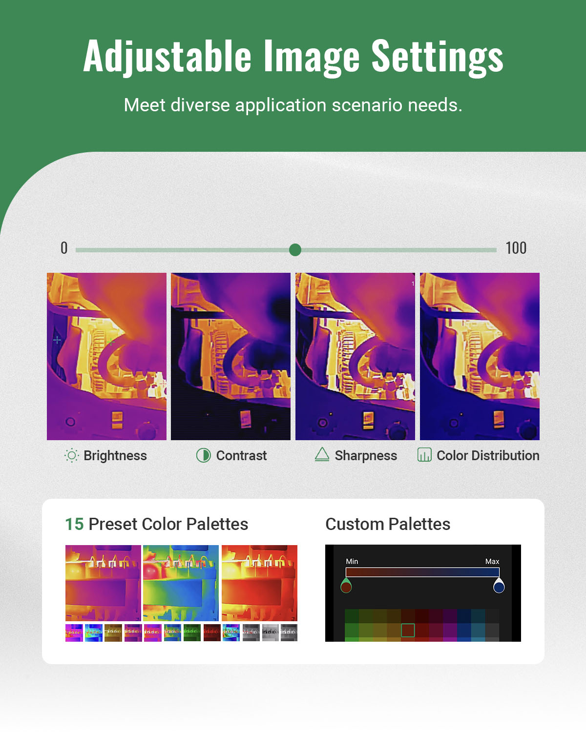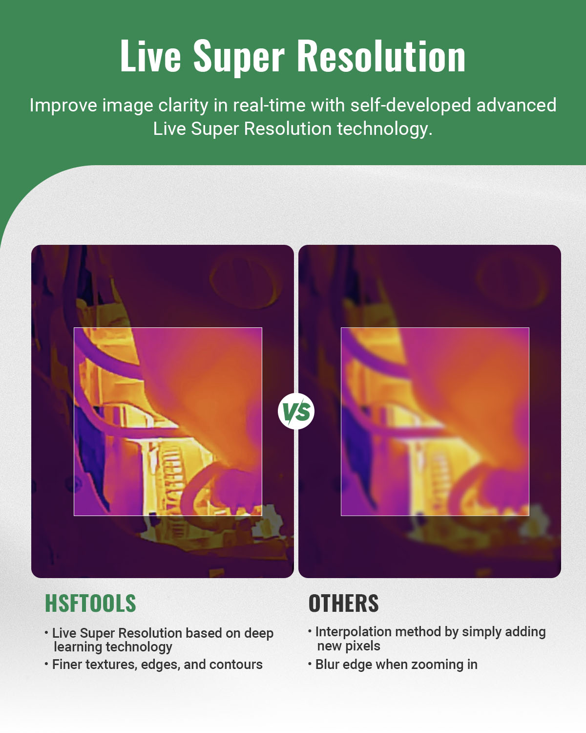 【Ultimate IR Imaging Experience】Enable the HSFTOOLS Live Super Resolution image enhancement, it can boost the resolution from 256x192 IR detector resolution to 960x720 thermal imaging resolution in real-time. Select from 15 preset color palettes or create personalized ones to suit different scenarios. Fine-tune image settings for sharpness, contrast, brightness, and more to achieve optimal imaging, perfect for home inspection, automotive repair, electric maintenance, HVAC maintenance, etc.