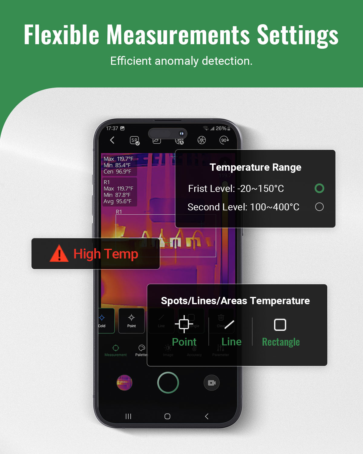【Flexible Measurement Settings】(1) The Finder S2 thermal imaging camera covers wide ranges of -4°F to 752°F, ideal for inspectors or engineers. (2)Custom level and span settings for manual temperature upper and lower limit adjustments. (3) Customizable measurement tools to display target temperature for points, lines, and areas. (4) High/low-temperature alarm setting, with visual OSD, audio, and vibration notifications allows for preemptive action before significant failures occur.