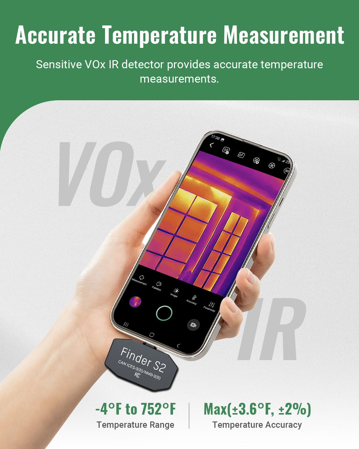 【Accurate Temperature Measurement】Utilizing advanced VOx detectors, Finder S2 achieves a remarkable temperature sensitivity of 0.04°C and ensures the temperature reading discrepancy within the range of ±3.6°F or ±2%. Additionally, the thermal imager allows you to change emissivity settings based on specific materials and adjust the distance to objects, ensuring more accurate temperature measurements on various substances, including wood, bricks, and more.